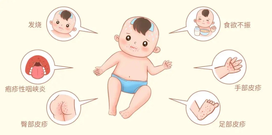 在发病早期,患者常表现为低热、疲倦、食欲下降、身体不适、腹痛等前驱症状。发热1~2天后可在口腔黏膜出现散在疼痛性粟粒大小般的水泡,手、足、臀部等处出现红色小斑丘疹或疱疹。部分病例仅表现为皮疹或疱疹性咽峡炎,个别病例或无皮疹。