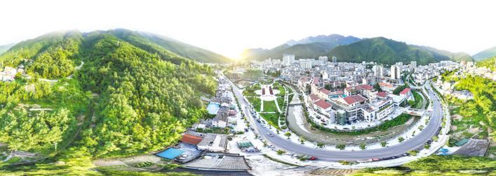 夏日,从无人机上俯拍松柏,集镇像一条小舟静卧在群山绿浪之中,而青杨河从舟首至舟尾穿城而过。