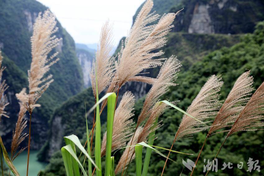 我去的时候既无雨也无晴,登高眺望,云层灰压压的,层层大山延绵不绝,从雕岩望景台往下坪方向走,一路上都是茅草,随着山间的风起起伏伏,刚开花的茅草呈现浅粉色,一条条的细蕊随风摆动,像一面小旗子;开花的茅草花呈现白色,摆动得如同扇面,轻轻摇晃。