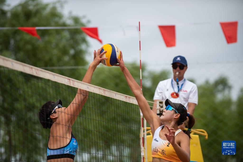 7月13日,山西一队选手杨思宇(左)与山东二队选手邢佳怡在女子组第一阶段比赛中。最终,山西一队选手杨思宇/崔睿萱以0比2不敌山东二队选手曹舒婷/邢佳怡。新华社记者 李旭伦 摄