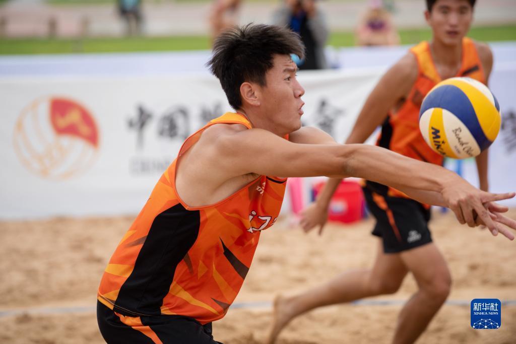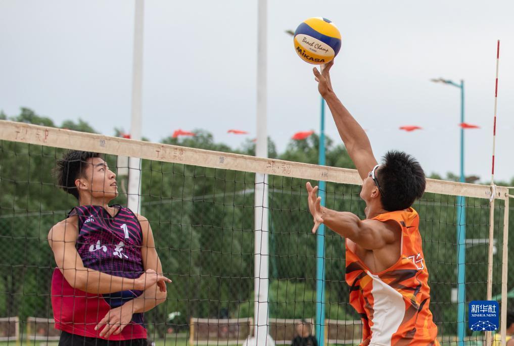 7月13日,巢湖学院一队选手张睿琦(右)在男子组第一阶段比赛中拦网。最终,巢湖学院一队选手邢孔权/张睿琦以0比2不敌福建一队选手陈品宏/蔡富泉。新华社记者 李旭伦 摄