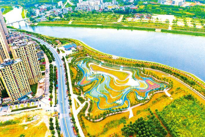 7月6日,远眺十堰市郧阳区新建成的外滩公园。该园是汉江北岸生态护岸景观工程规划建设的一部分,栽植有景观树木、地被植物,新修了休闲游步道和自行车道及广场等。