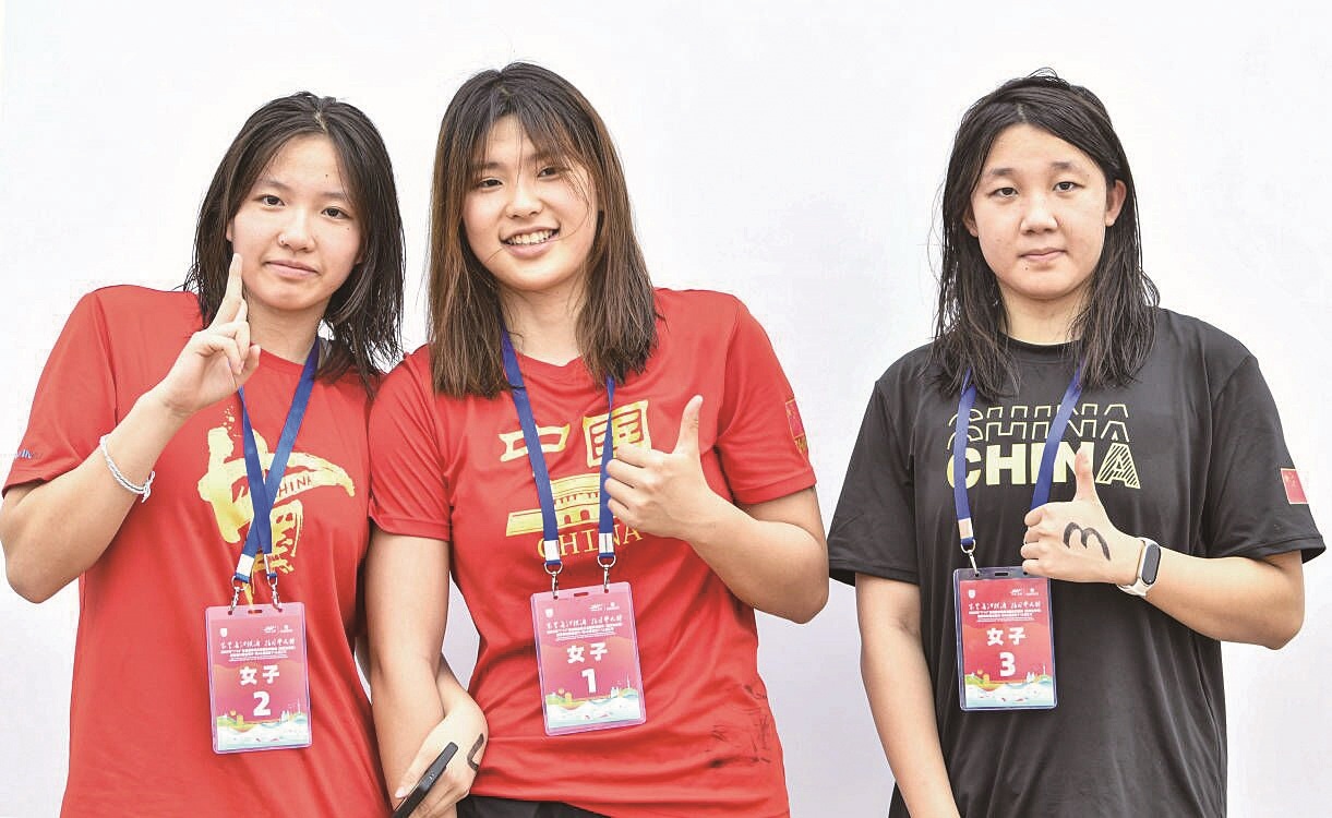 个人抢渡赛女子组前三名黄子琪(中)、李馨璇(左)、夏自璇(右)