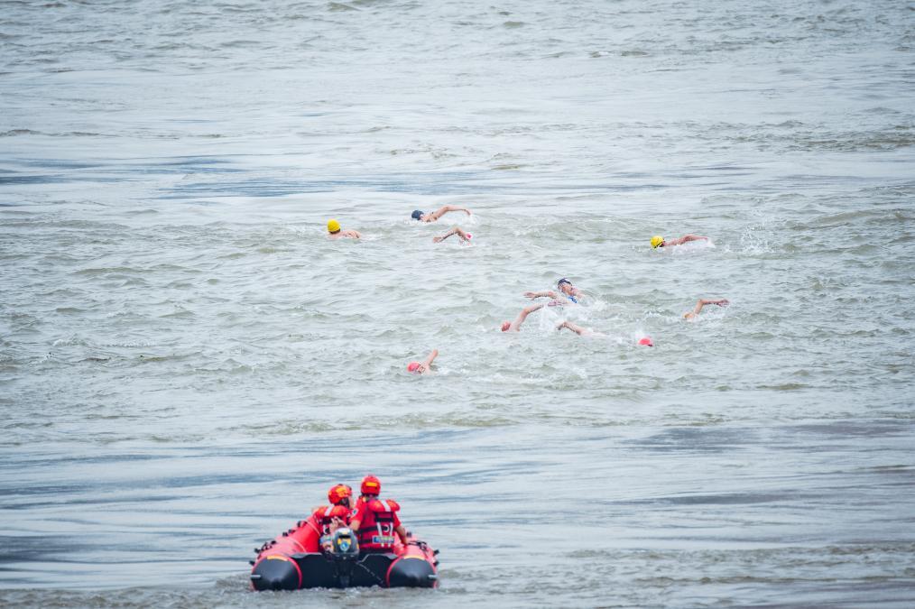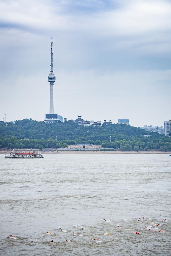 汛期的长江,水宽浪急,想要组织这场将近2000人规模的公开水域活动并非易事。记者在现场观察,江上船只近百艘,护卫指挥船、水上医疗艇、救援艇配备齐全,岸边码头的安保秩序井然,这些工作带给选手、观众足够的参赛安全感和观赛体验。