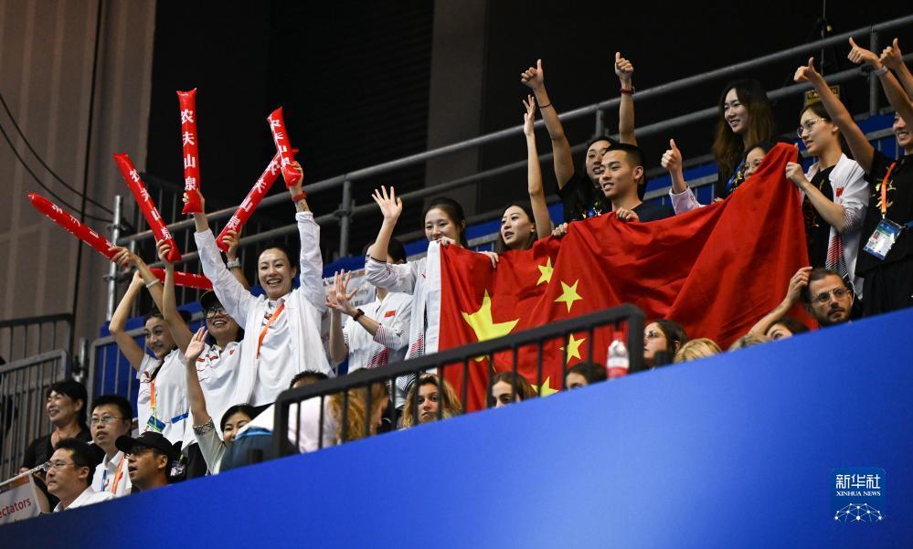 7月16日,中国队成员在看台为王柳懿/王芊懿助威。新华社记者 夏一方 摄