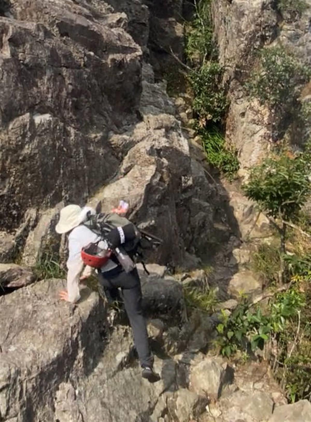 视频显示,一女子正准备下山,一名男子指挥称“那边有绳子”,然而女子并没有听从男子建议去抓绳子,而是双手扶着岩壁,身体紧贴巨石,一步一步慢慢往下行进,就在女子蹲下身子试图去踩下方的岩石时,女子没站稳瞬间滚落下去,旁人发出阵阵惊呼。从视频中可以看到女子头上并没有戴安全头盔,而是把头盔挂在了背包上。