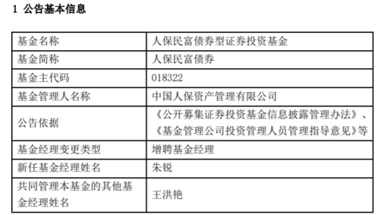 中国经济网北京7月18日讯 今日,中国人保资产管理有限公司发布基金经理变更公告,人保民富债券(A类018322;B类018323)增聘基金经理朱锐。
