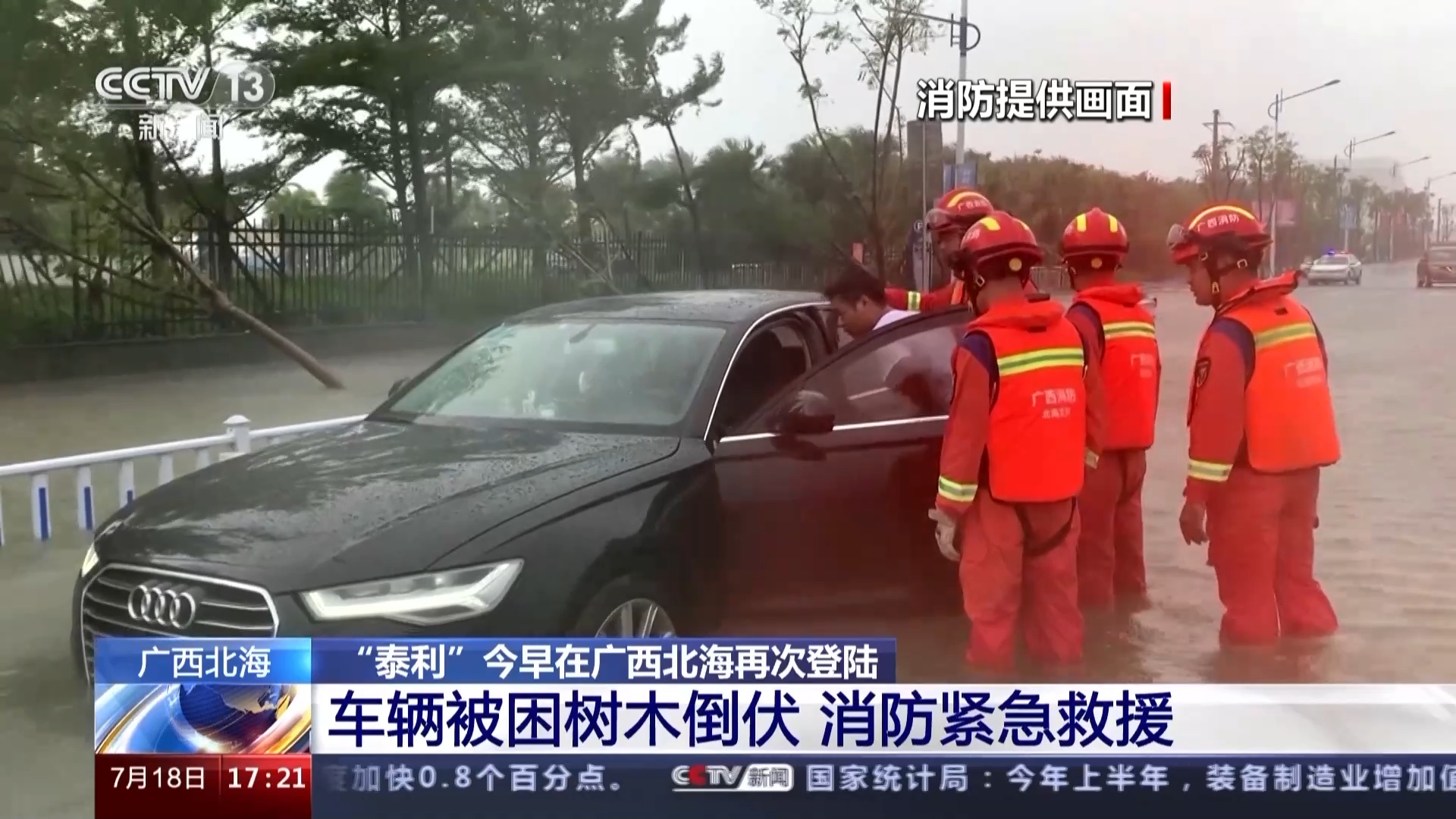今天(18日)5点多,“泰利”以强热带风暴级在广西北海市再次登陆。受此影响,北海市多地出现强降雨,不少树木倒伏、车辆被困,当地消防紧急救援。