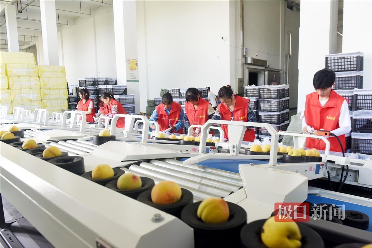 近日,黄桃新鲜上市,位于湖北省老河口市光化街道办事处雷祖殿村的京东农场冷链仓储物流中心,收购、运输黄桃的大小货车络绎不绝,分拣、包装、储存黄桃的工人们忙得不亦乐乎。