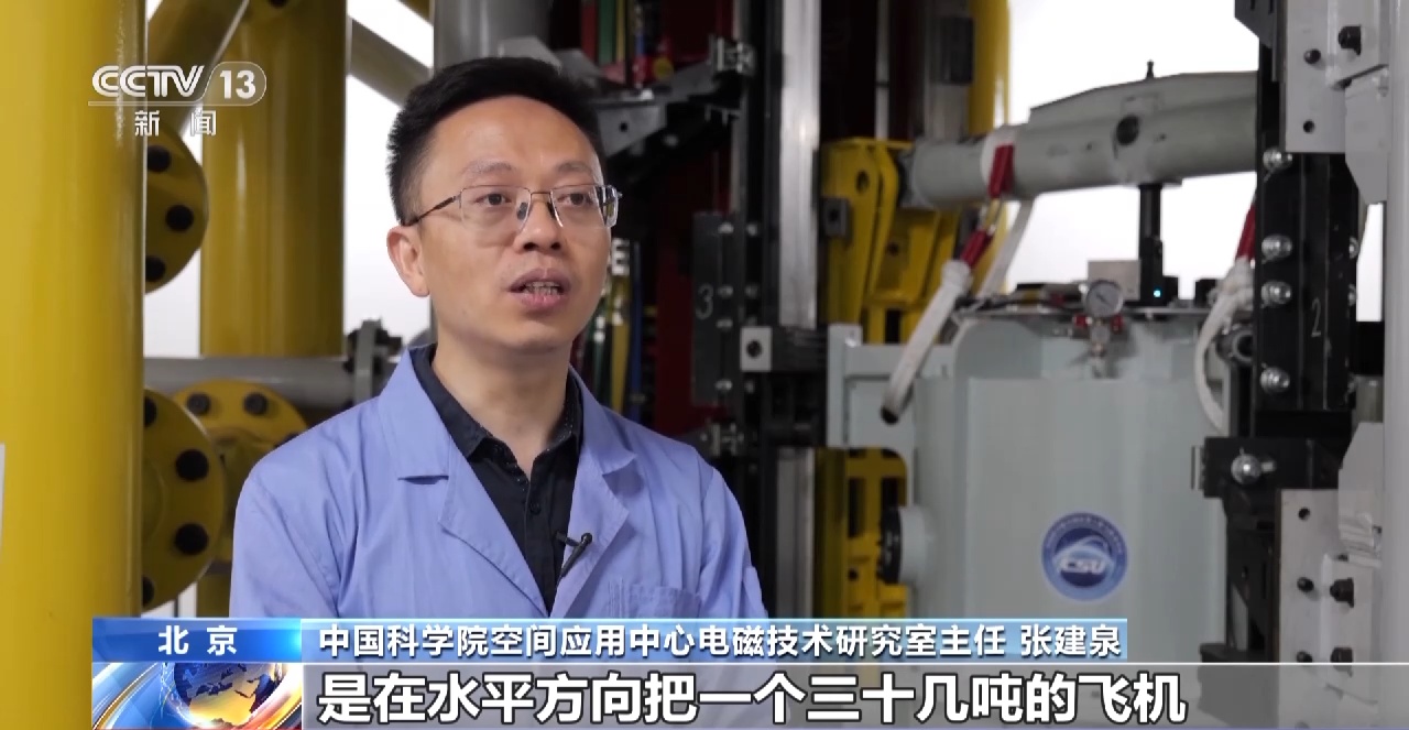 中国科学院空间应用中心电磁技术研究室主任 张建泉:航母的电磁弹射技术是在水平方向,把一个三十几吨的飞机往水平方向弹射。我们的电磁弹射,实际上是把一个实验舱体通过垂直方向的加速,把实验舱体加速到20米每秒,实现上抛和下落的过程的控制,实现整个地基的微重力的模拟。