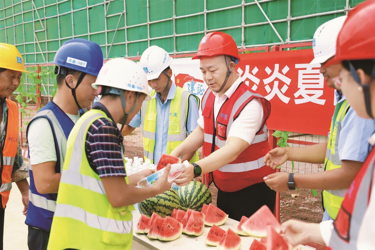 盛夏酷暑,热浪来袭。近日,中建二局湖北分公司组织开展“夏送清凉”活动,为鄂州光电子产业园标准化厂房项目工友带去西瓜、盐汽水等防暑物品。鄂州光电子产业园标准化厂房项目用地面积为6.75万平方米,建成后将成为鄂州一处集研发设计、成果转化、生产制造、产品展示和生产配套功能于一体的高新技术企业集聚地。