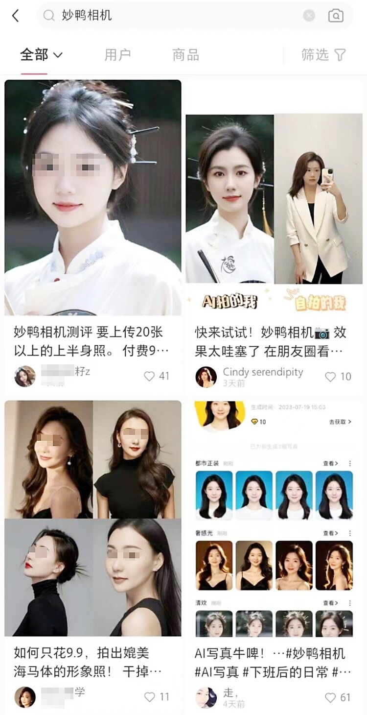 7月23日晚,家住杭州的卢女士看到朋友在朋友圈晒出了自己的九宫格写真,看上去十分精美,于是问朋友:“你又去照相馆拍照了?哪一家?怪好看的。”朋友在一串“哈哈哈”后解释:“这是小程序生成的,只要9.9元!”并发送来妙鸭相机的小程序链接。“用了一下发现真的不输照相馆,这九块九花得值!”卢女士告诉极目新闻记者。