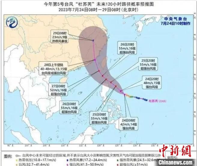 根据当天发布的气象信息,“杜苏芮”已升级为强台风级,风速达到45米/秒-50米/秒,14级-15级。登陆以后,“杜苏芮”将向北偏西方向移动,强度迅速减弱。