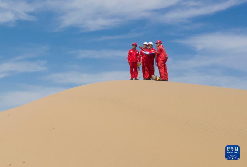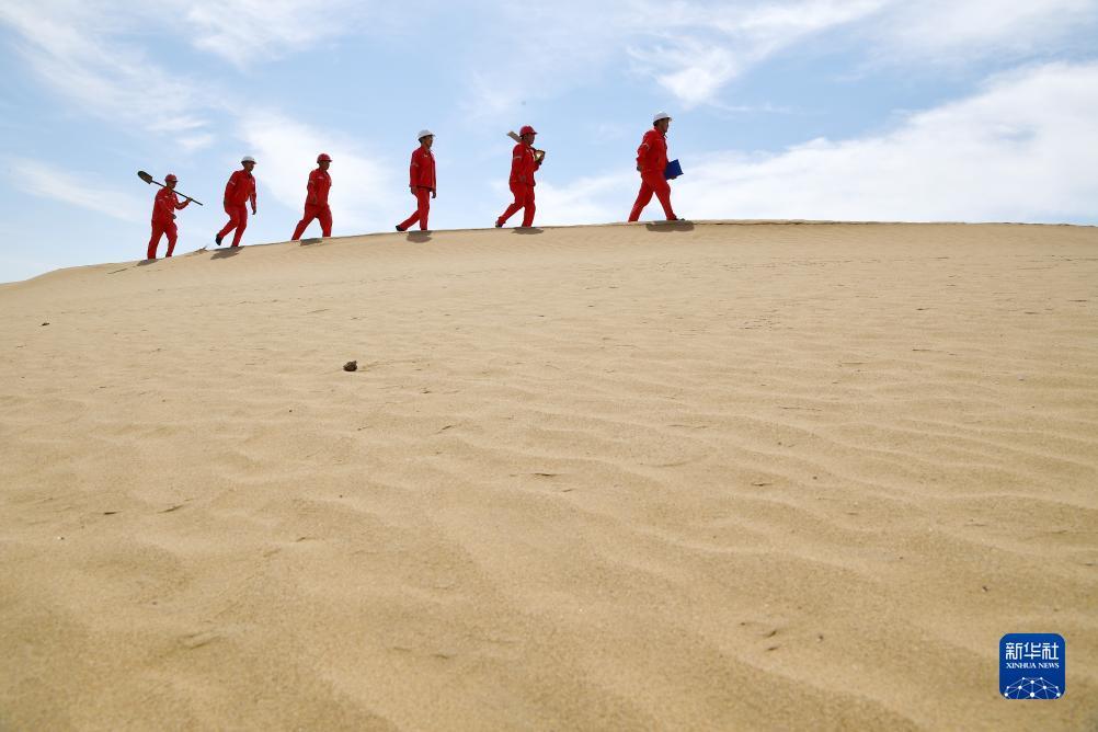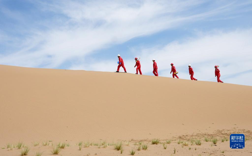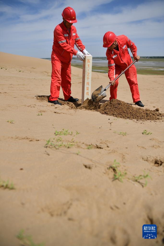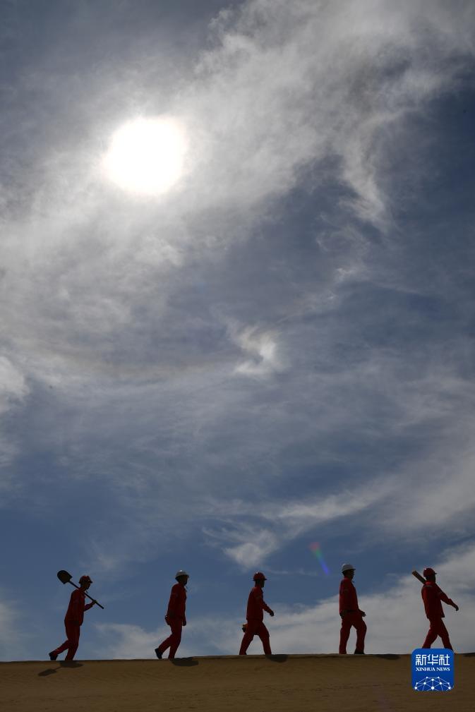 巡线队员在巡线时穿越沙漠区域(7月23日摄)。