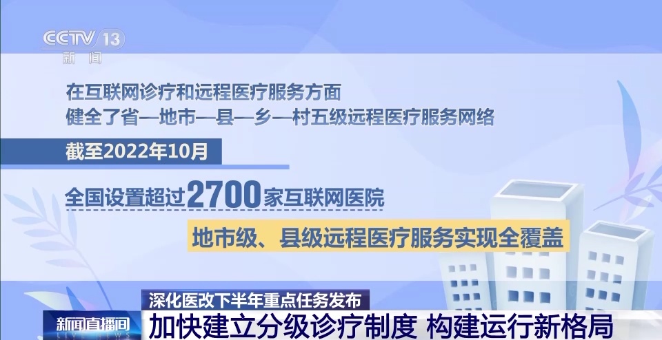 在互联网诊疗和远程医疗服务方面,健全了省—地市—县—乡—村五级远程医疗服务网络,截至2022年10月,全国设置超过2700家互联网医院,地市级、县级远程医疗服务实现全覆盖。