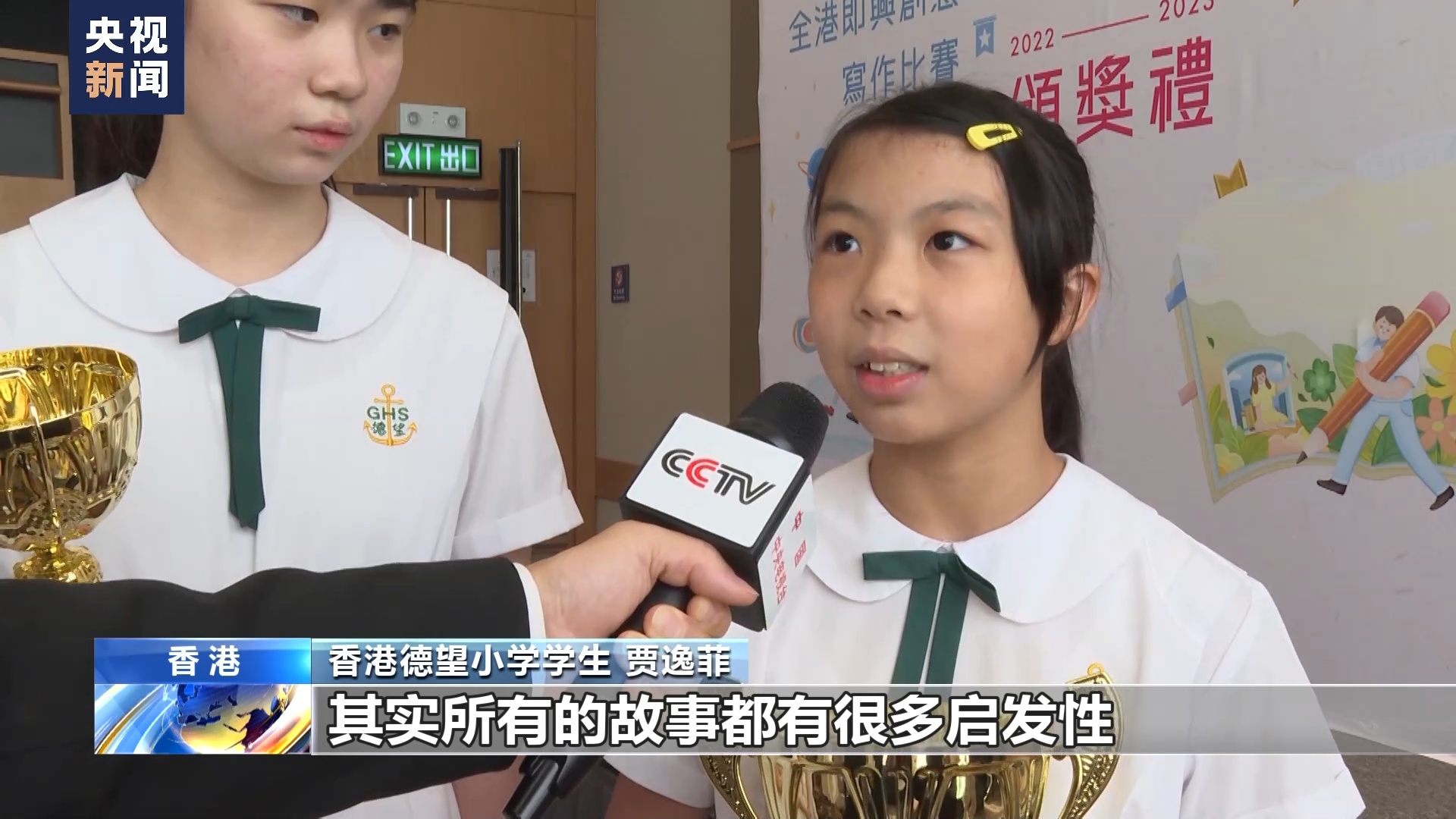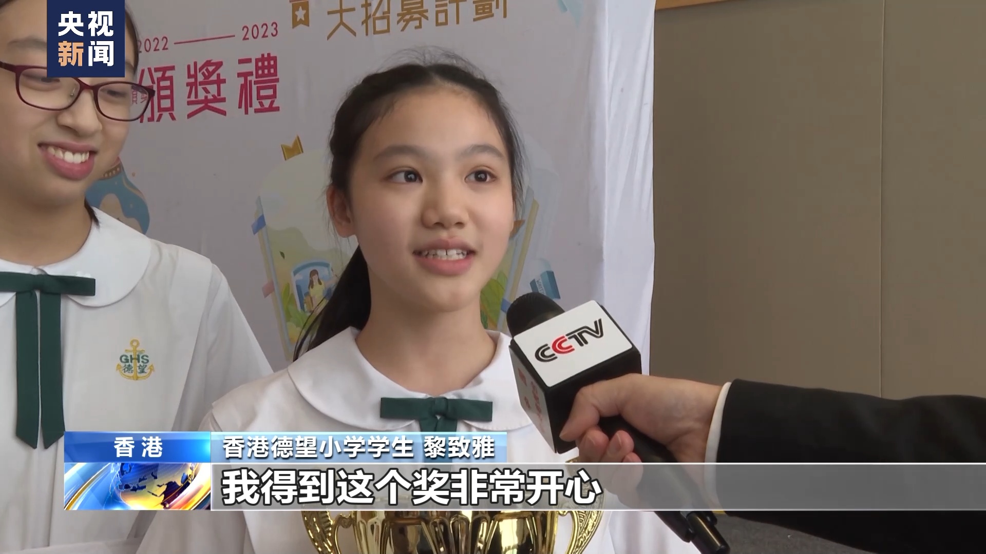 香港德望小学学生 黎致雅:我得到这个奖非常开心,读书能让我学习更多的词语,将来我也会多看一点书,我也能多学习知识。