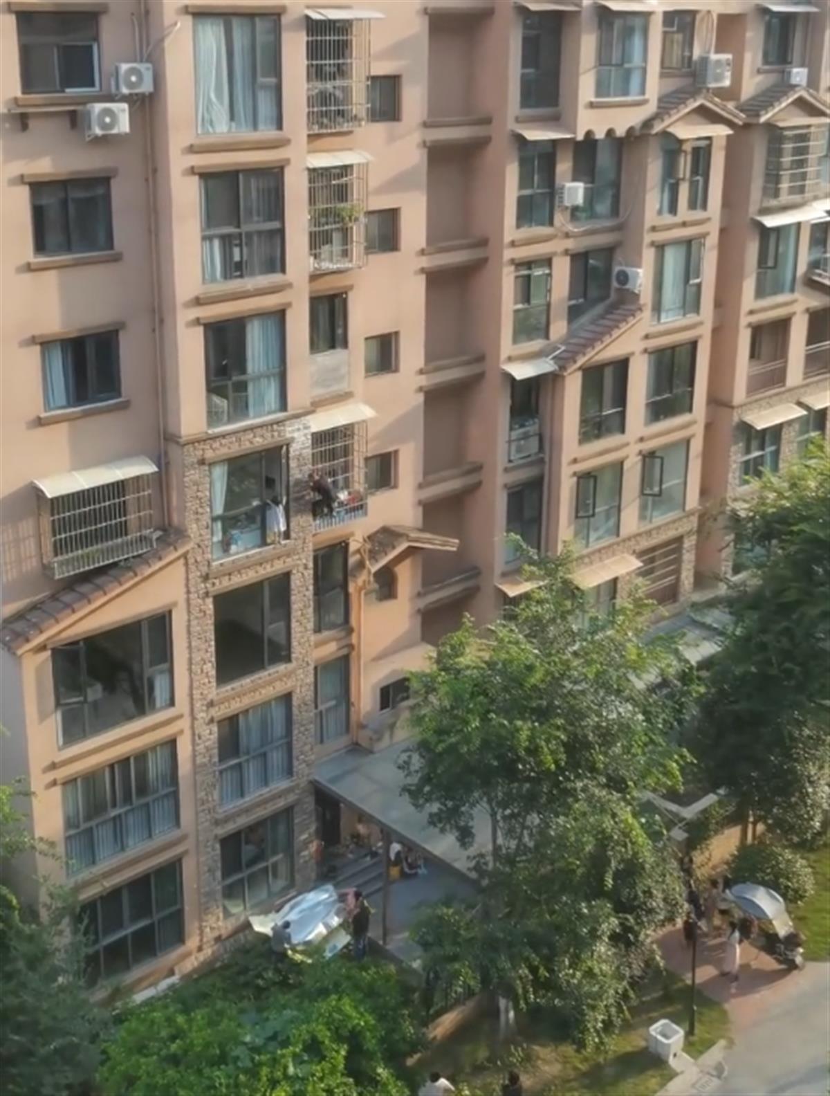 张女士介绍,事发楼栋6楼一名业主看到情况后,经过简单评估,就从三楼楼梯间的采光透气窗翻出墙外,踩着燃气管,并借助防盗窗防护栏等悬空攀爬,最终爬到了小女孩所在的4楼窗口,并将小女孩推进了屋内。