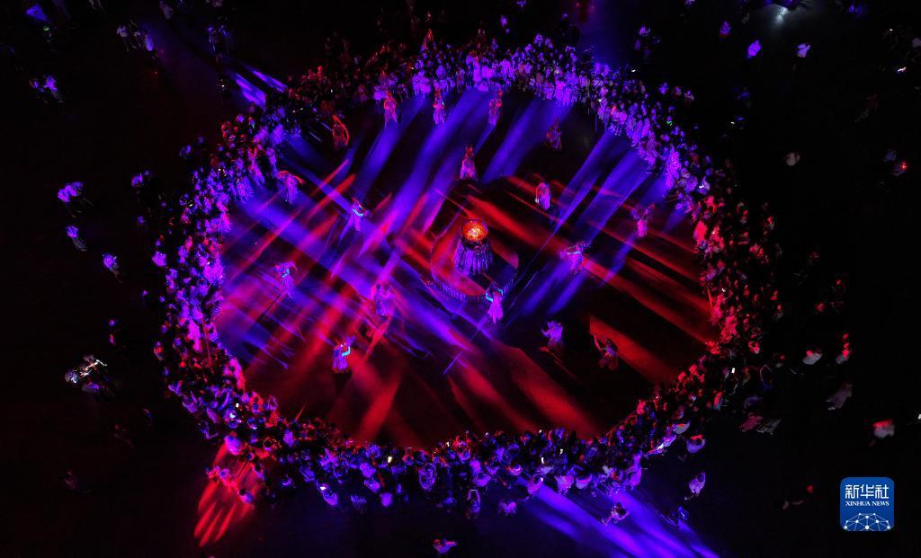 游客在陕西省汉中市留坝县县城内参加篝火晚会(7月22日摄,无人机照片)。