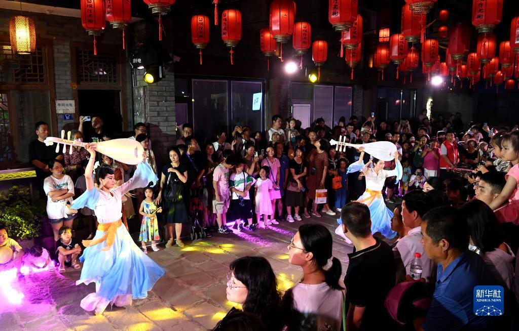 游客在陕西省汉中市留坝县老街上观赏文艺演出(7月22日摄)。