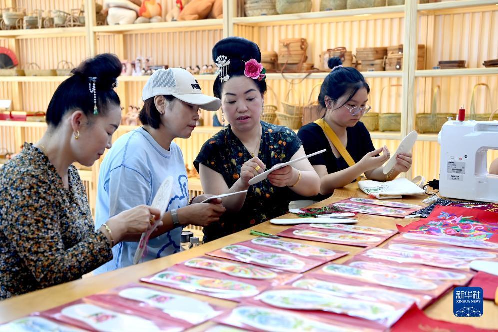在陕西省汉中市留坝县老街内的一家手工店铺里,当地妇联邀请来自镇巴县的苗绣老师(右二)为当地妇女及游客教授苗绣(7月25日摄)。