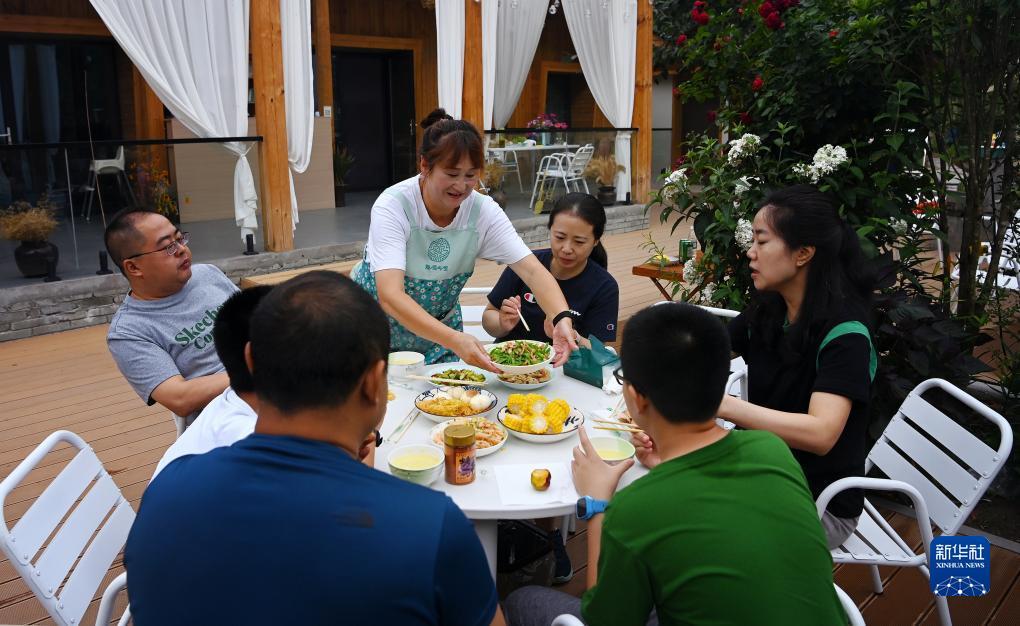 游客在陕西省汉中市留坝县紫柏街道小留坝村的一家民宿内吃早餐(7月24日摄)。