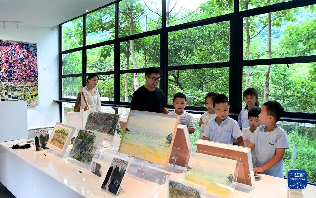 参加研学的小学员在陕西省汉中市留坝县小留坝村楼房沟玉双美术馆内参观(7月24日摄)。