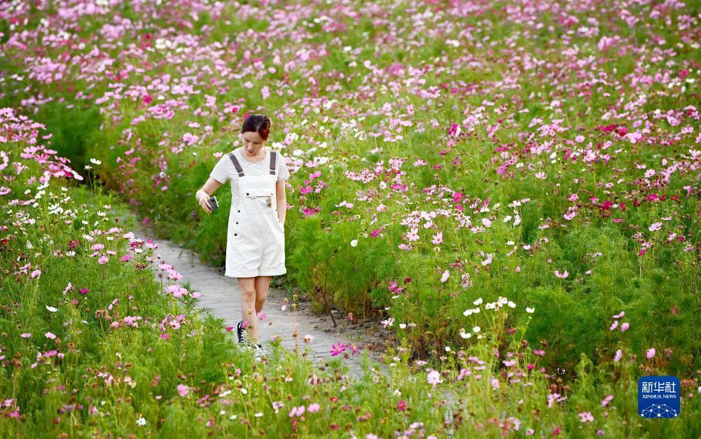 游客在陕西省汉中市留坝县城金水湾花海游玩(7月24日摄)。