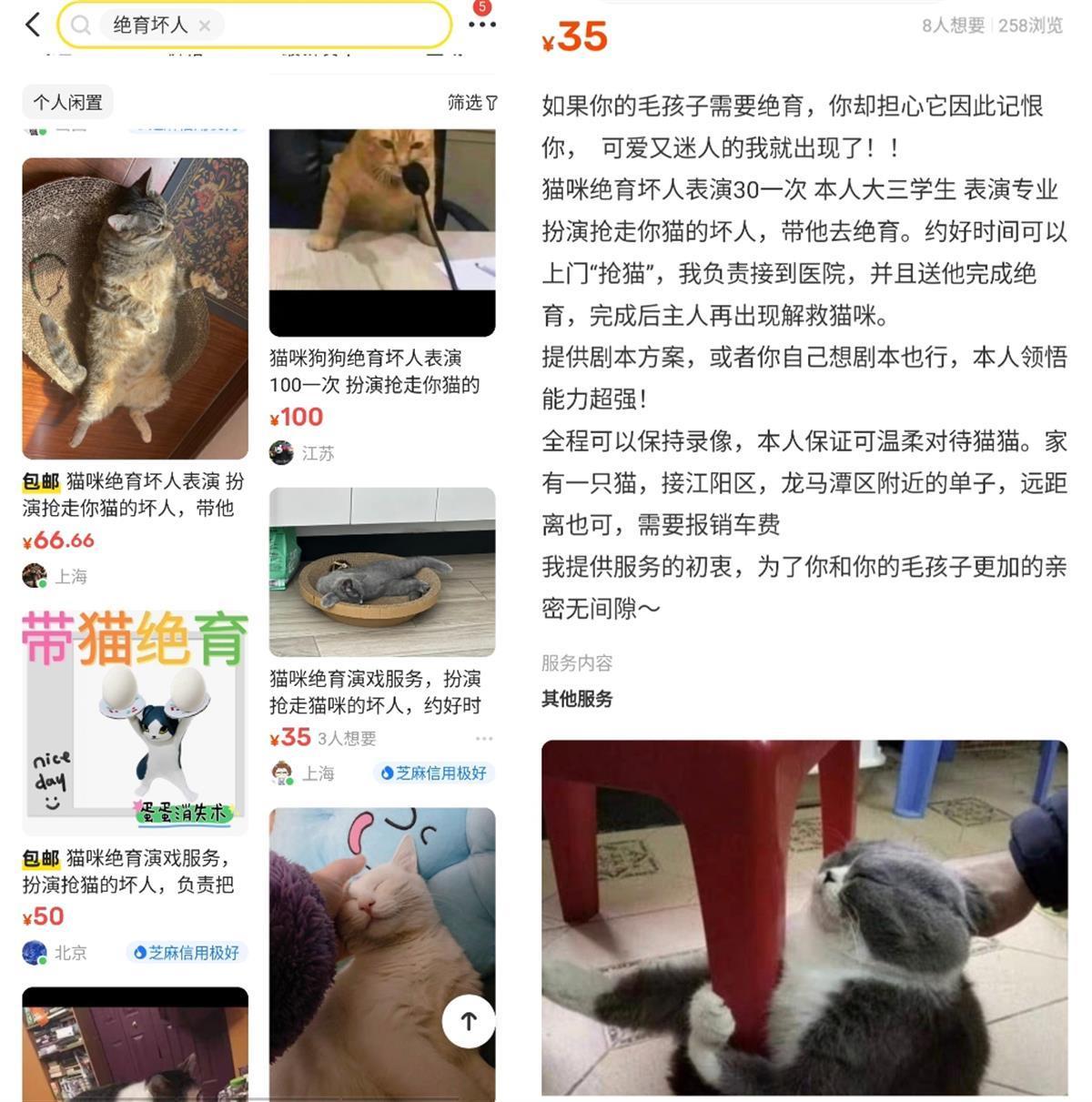 极目新闻记者在二手平台搜索发现,不少人上架了兼职产品——在猫狗绝育的过程中帮助主人演坏人,一次价格从30-50元不等。