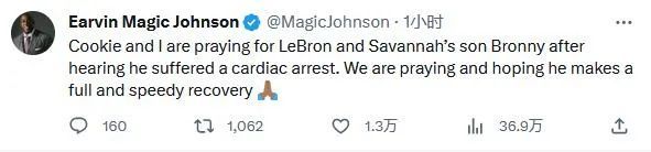 在社交媒体上,约翰逊、塔图姆等多位NBA名宿及现役球员发文为布朗尼祈福。“魔术师”约翰逊写道:“在得知勒布朗和萨凡纳的儿子布朗尼心脏骤停后,我们正在为他祈祷,希望他能尽快完全康复。”(完)