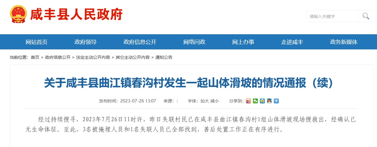 央视网消息:咸丰县人民政府官网7月26日通报,经过持续搜寻,2023年7月26日11时许,昨日失联村民已在咸丰县曲江镇春沟村1组山体滑坡现场搜救出,经确认已无生命体征。至此,3名被掩埋人员和1名失联人员已全部找到,善后处置工作正在有序进行。