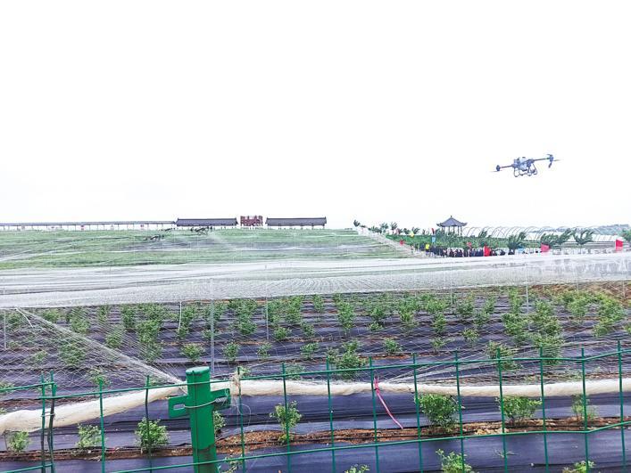4月底,在赵棚镇伍欣甸园蓝莓基地,无人机正在飞防作业,来自全国各地的专家及农技人员齐聚现场,进行观摩学习。