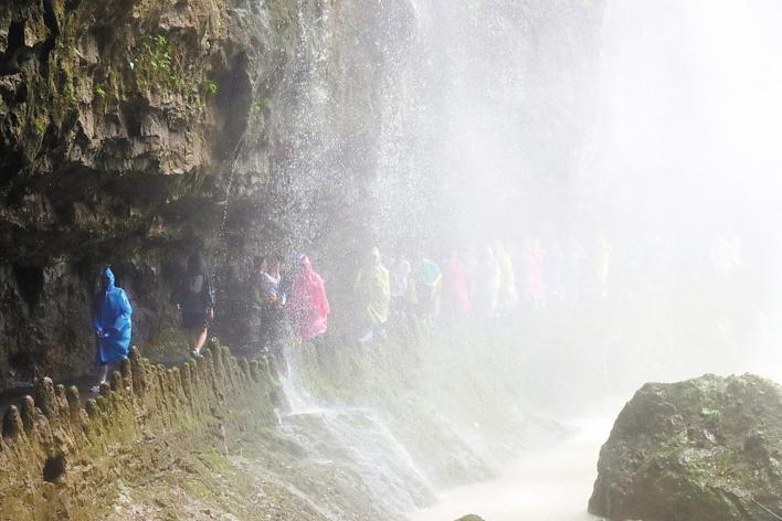 7月20日上午,宜昌市夷陵区三峡大瀑布景区,近百名游客身披雨衣,脚踏鞋套,排着长龙,依次钻入瀑布,水花四溅处,尖叫连连。