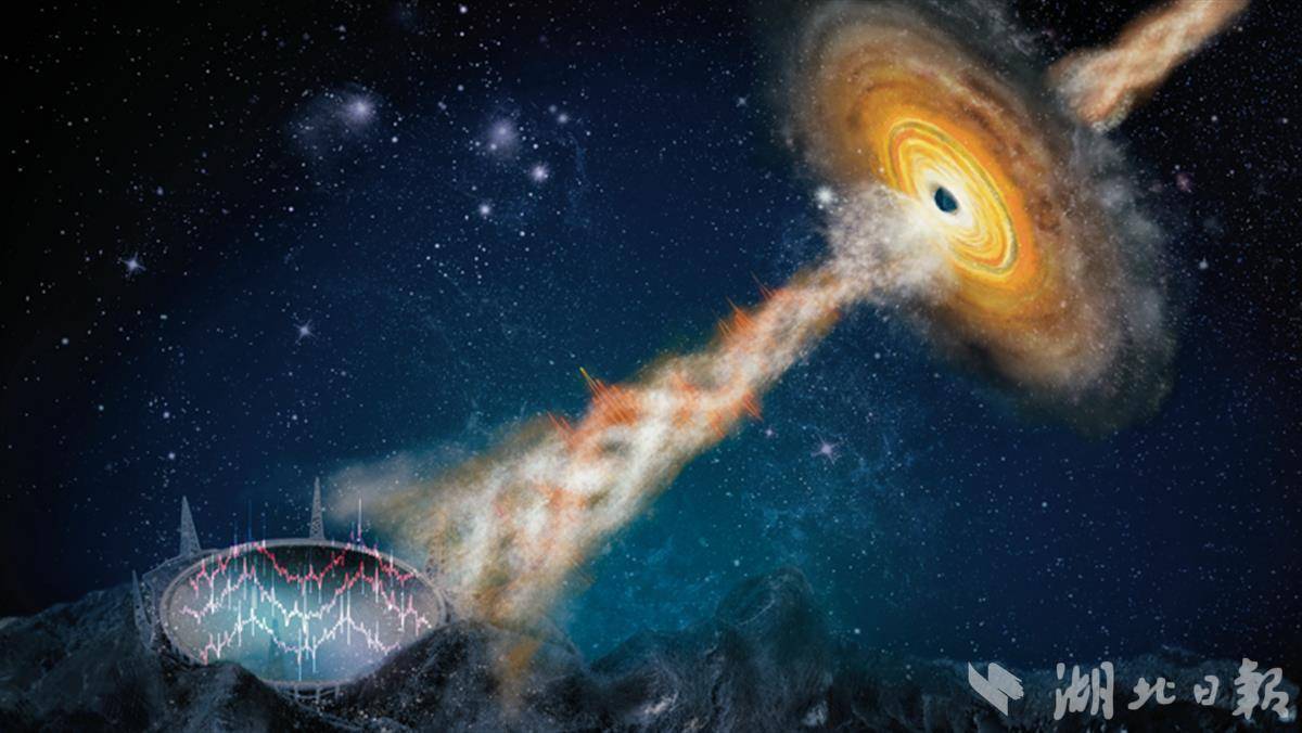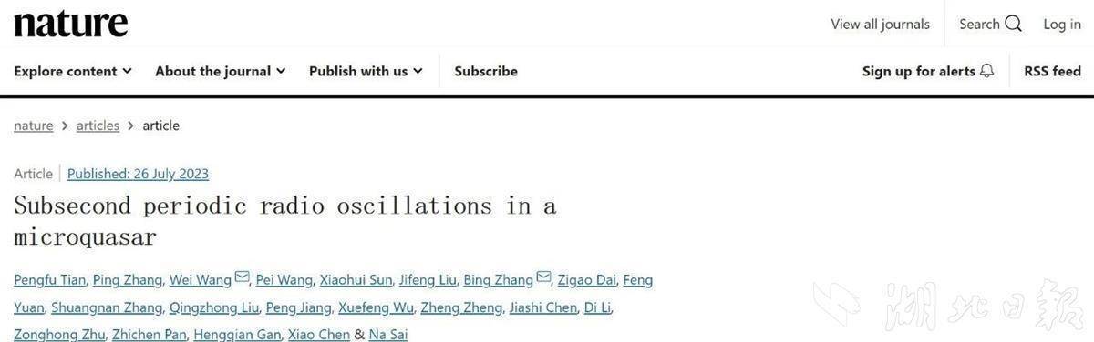 湖北日报讯(记者田佩雯)北京时间7月27日凌晨,Nature(《自然》杂志)发表了武汉大学物理科学与技术学院天文学系王伟教授团队关于黑洞的最新研究成果,论文题目为“Sub-second periodic radio oscillations in a microquasar”(微类星体中的亚秒级周期射电振荡)。武汉大学为第一署名单位,武汉大学田鹏夫、张平、王伟教授及国家天文台王培博士是共同第一作者,王伟教授和美国内华达大学张冰教授是共同通讯作者。武汉大学陈佳诗、陈骁、赛娜、朱宗宏教授等是共同作者。