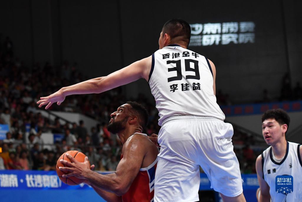 7月26日,香港金牛队球员李佳益(上)在比赛中防守长沙湾田勇胜队球员霍利菲尔德。新华社记者 陈振海 摄