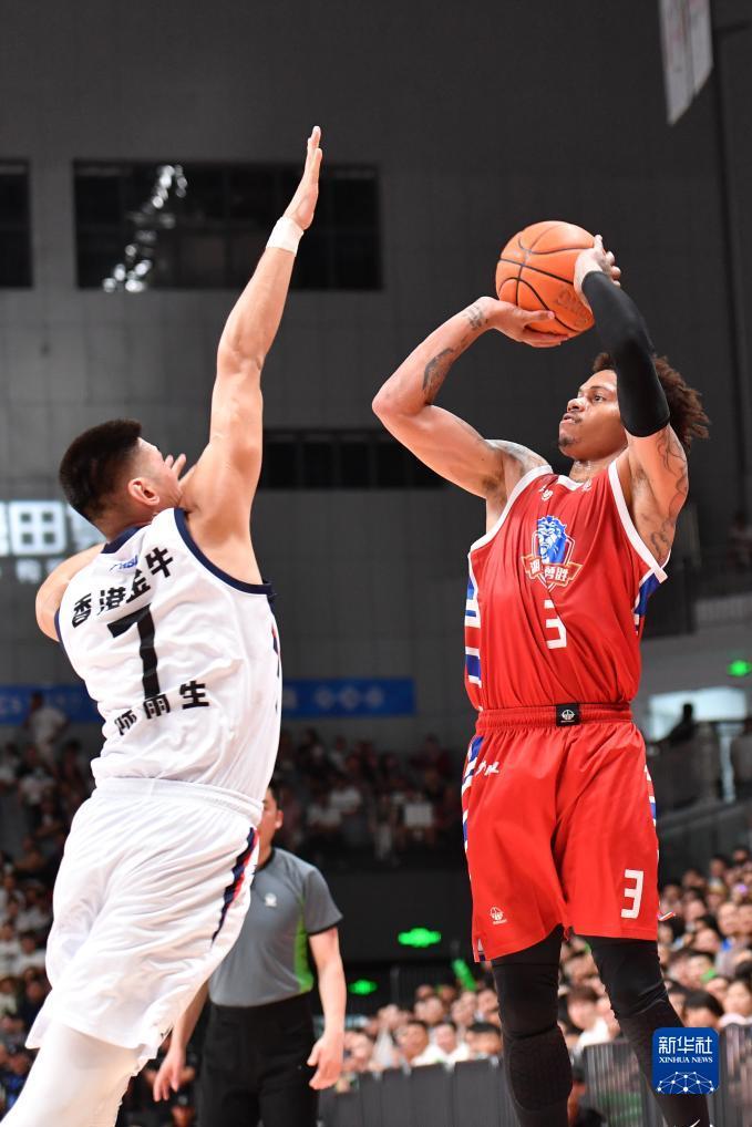 7月26日,长沙湾田勇胜队球员达格尔(中)在香港金牛队球员李佳益(左)防守下投篮。新华社记者 陈振海 摄