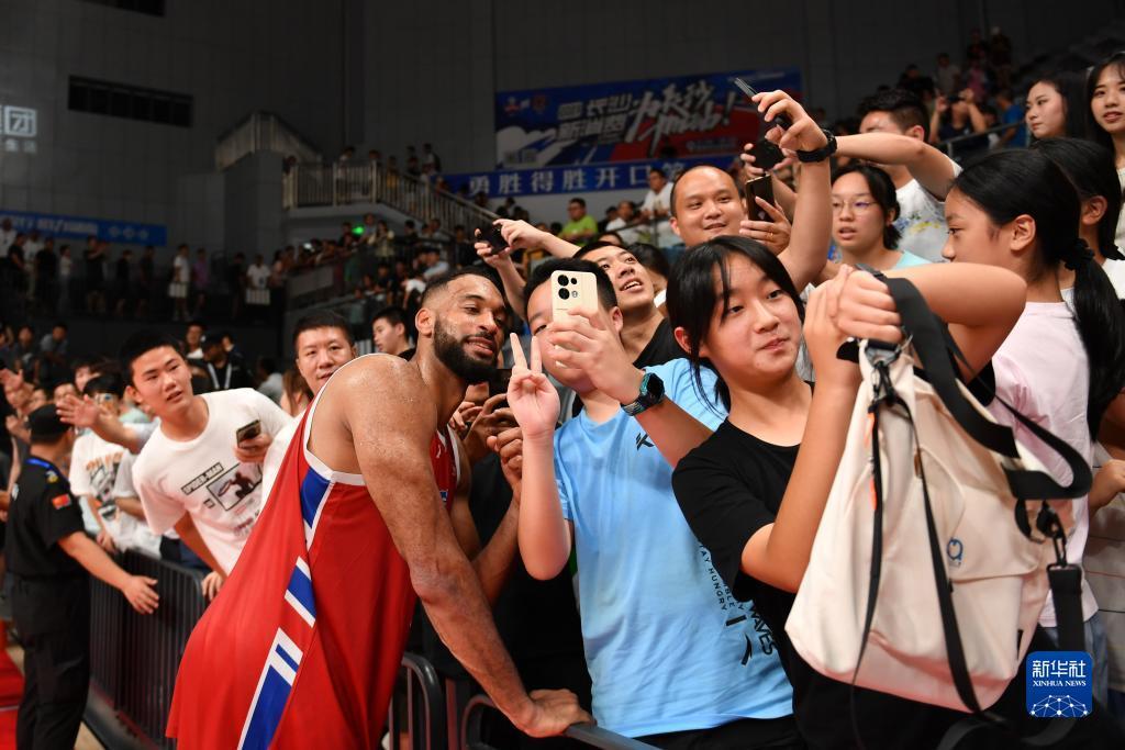 7月26日,长沙湾田勇胜队球员霍利菲尔德在比赛结束后与球迷互动。新华社记者 陈振海 摄