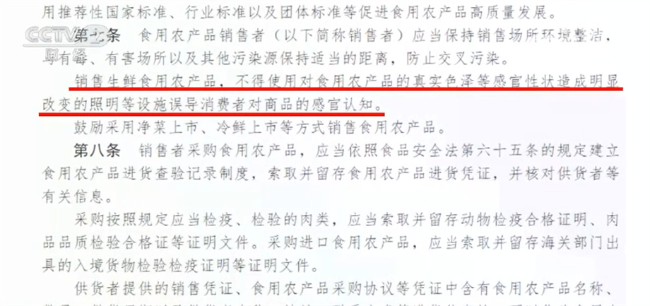 近日,国家市场监管总局修订发布的《食用农产品市场销售质量安全监督管理办法》中明确提到,销售生鲜食用农产品,不得使用对食用农产品的真实色泽等感官性状造成明显改变的照明等设施误导消费者对商品的感官认知。专家表示,使用“生鲜灯”并不代表该档口所售卖的肉类品质一定不好,但这种灯光的确存在迷惑消费者的作用。
