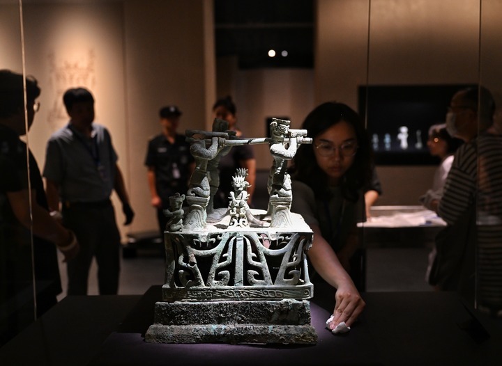 7月26日,工作人员在三星堆博物馆新馆内布展。新华社记者 刘坤 摄
