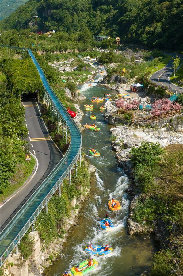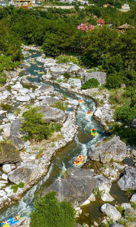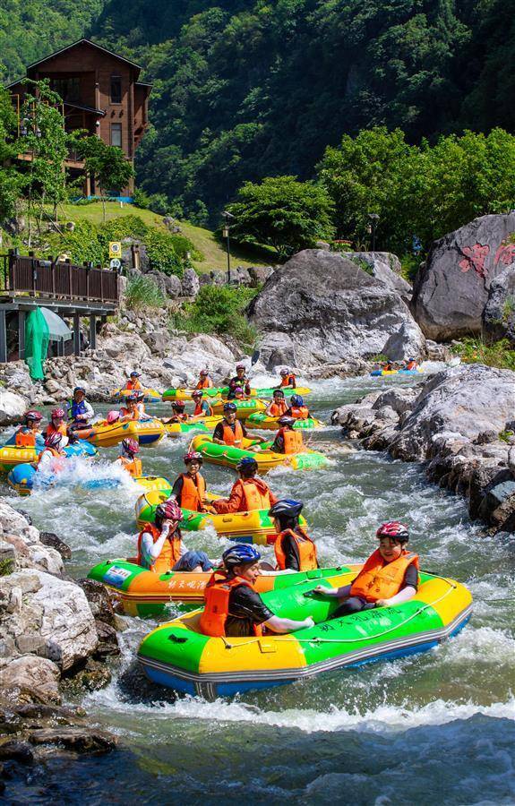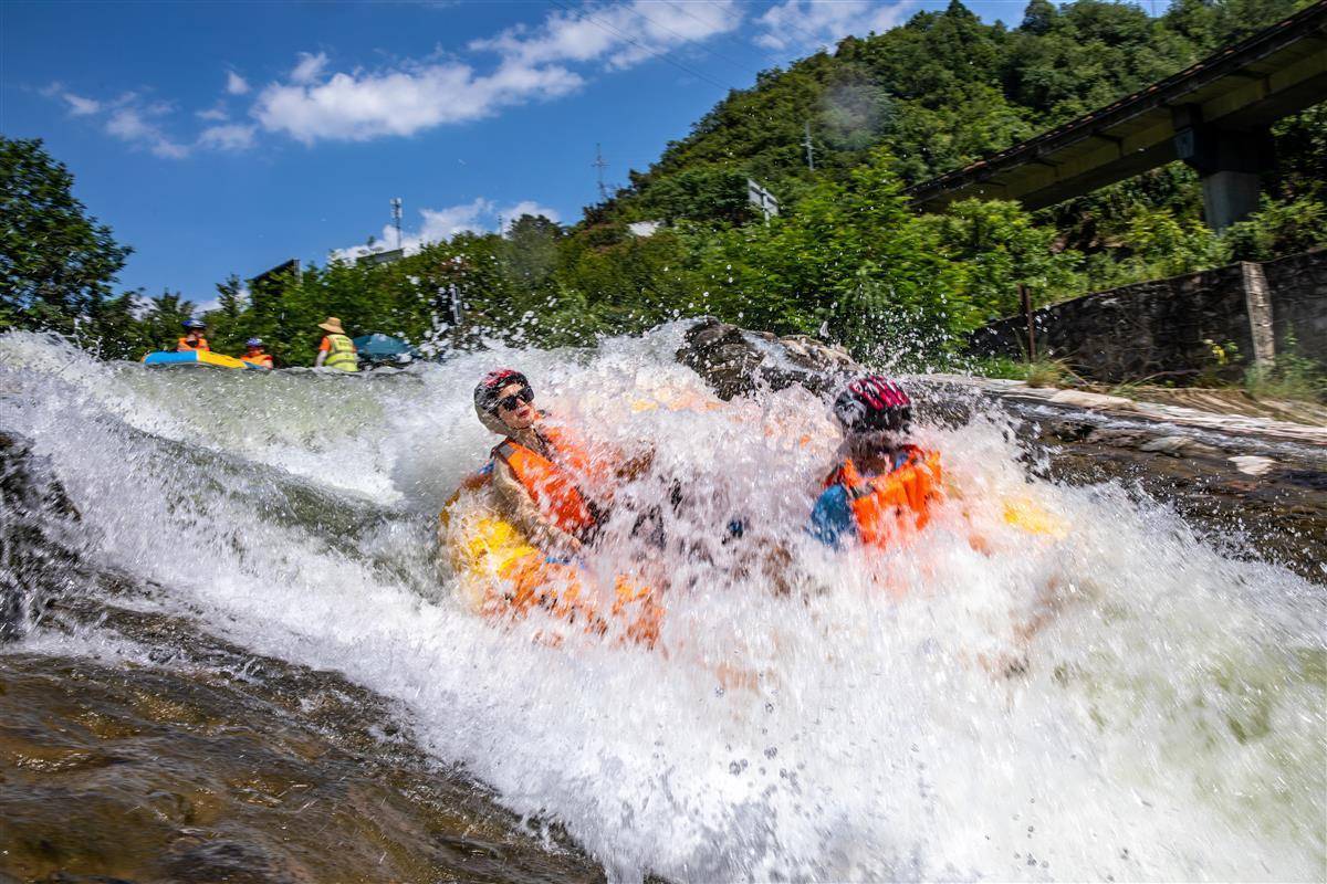 一群漂流客从高山峡谷间倾泻而出,任凭浪花劈头盖脸,只为和清凉撞个满怀,欢呼声与尖叫声不绝于耳。