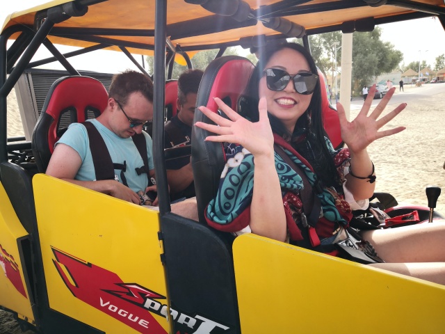 外国网红试坐和田大漠胡杨生态景区里的越野卡丁车 摄影 黎萌