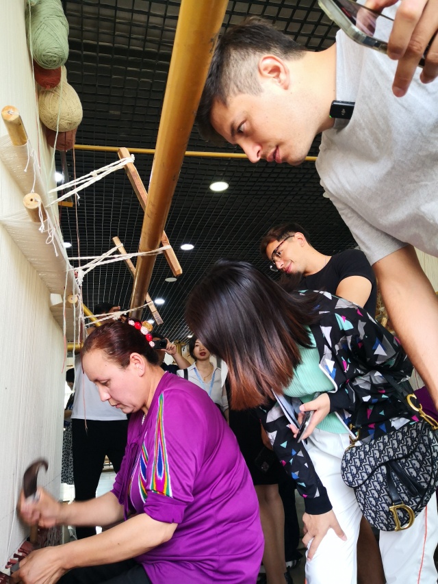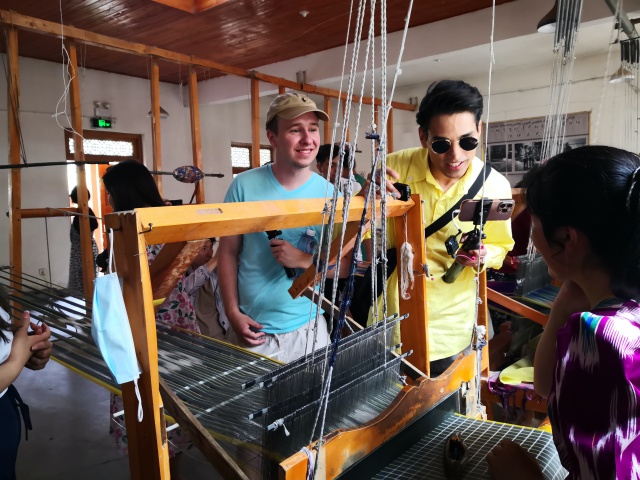 英国网红鹿可(左)和巴基斯坦网红严正平参观艾特莱斯丝绸公司的手工织机作坊 摄影 黎萌