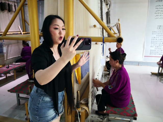 巴西网红塞米在“地毯之乡”玉龙喀什镇的纳克西湾地毯厂车间里拍摄视频 摄影 黎萌