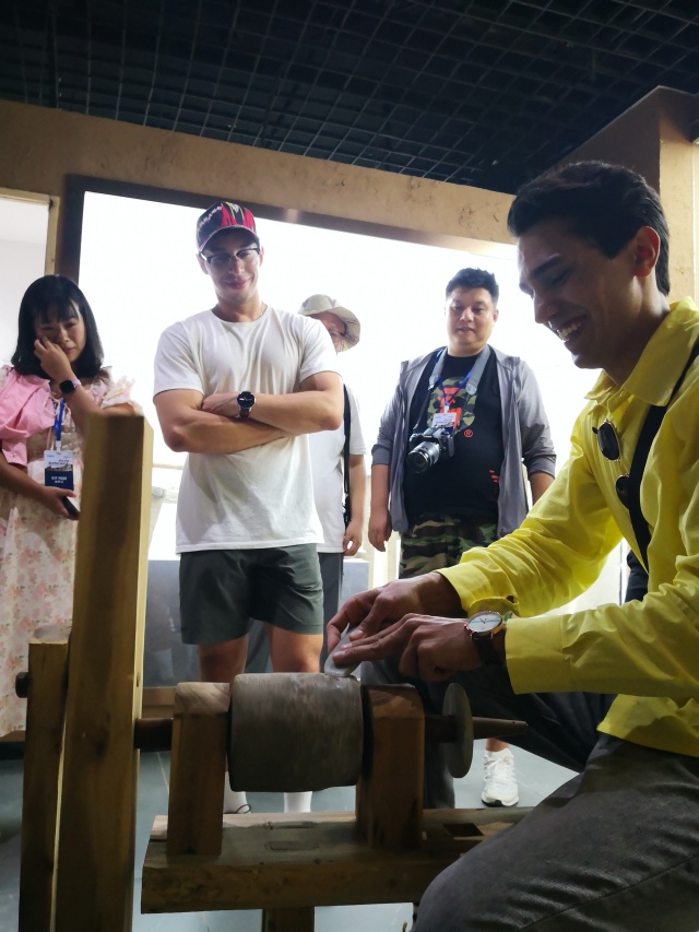 外国网红在和田昆仑古事馆体验打磨玉器的360度连续旋转砣具 摄影 黎萌