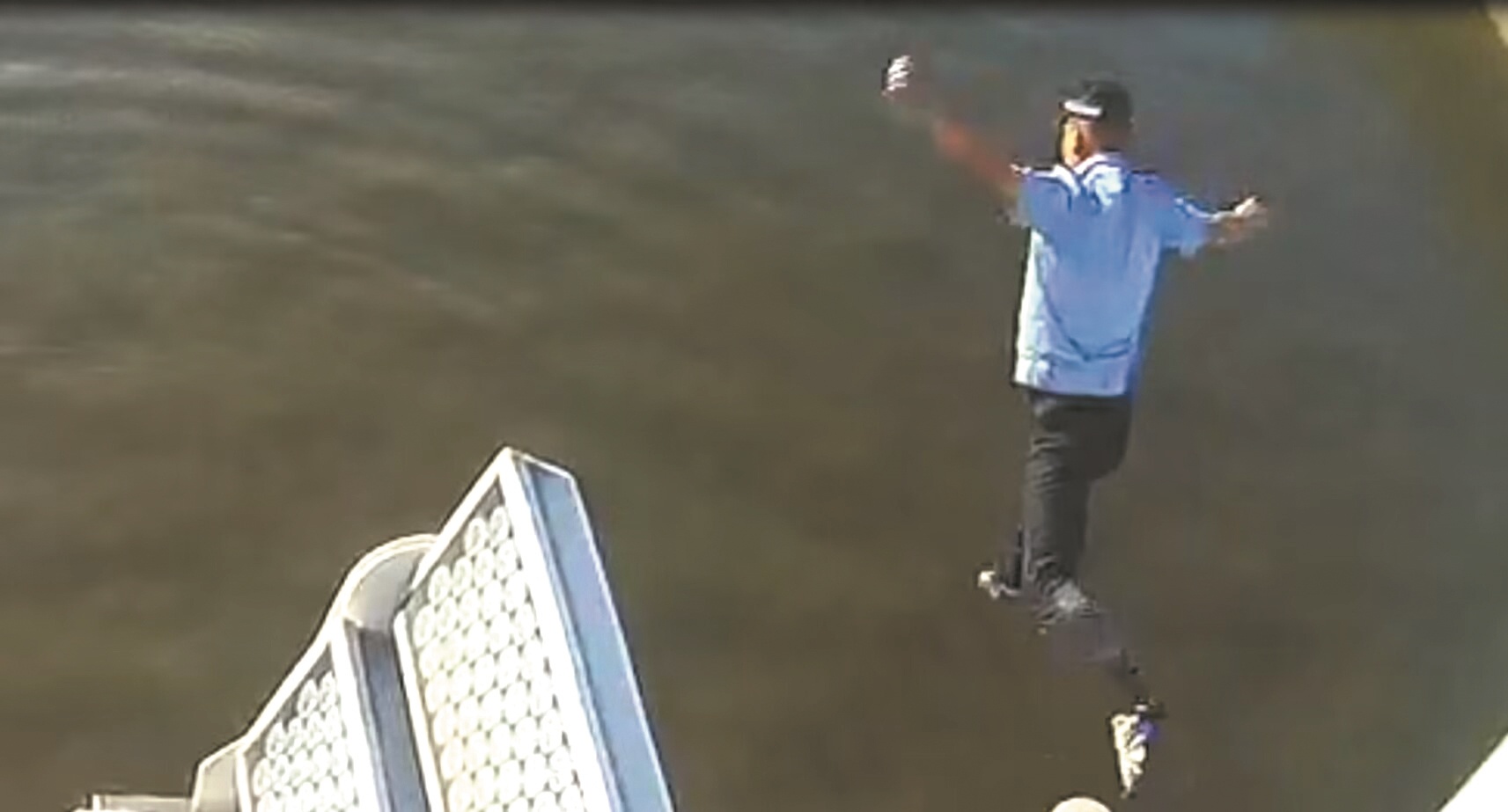 韩靖从桥面纵身跃入汉江 本版图片除署名外,均为警方执法记录仪视频截图