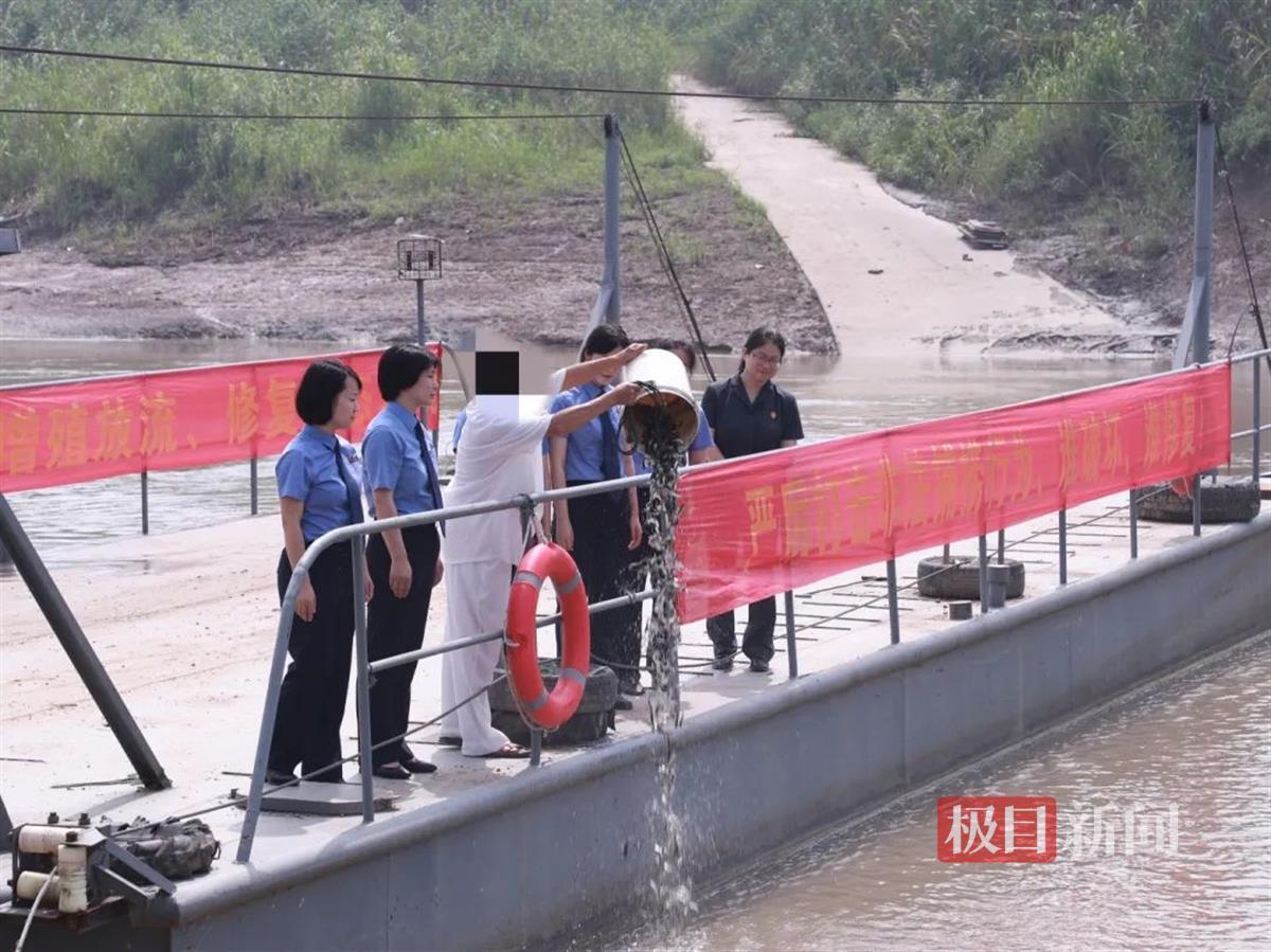 最后,仙桃市检察院还联合仙桃市法院、渔政执法部门,组织被告人杜某某等三人一同前往东荆河流域进行增殖放流,在检察官的现场监督见证下,50000余尾鱼苗欢快地游进水中。