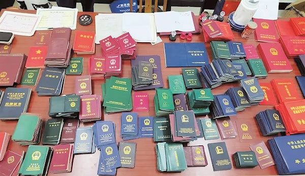 数十平方米的仓库里,300麻袋假证书、假证件堆成小山,仿冒公章密密麻麻码放在桌上,制假原材料总重量近8吨。随着主犯蔡某落网,这座“制假工厂”也揭开面目。7月29日,记者从潜江市公安局获悉,该局历经两个多月,破获一起特大制售假证案件,抓获犯罪嫌疑人57人,现场查扣假冒证件及半成品14万余份,斩断一条涉及湖北、湖南等13省市的制售假证黑产链条。