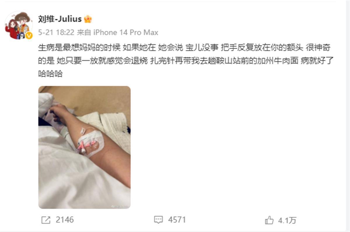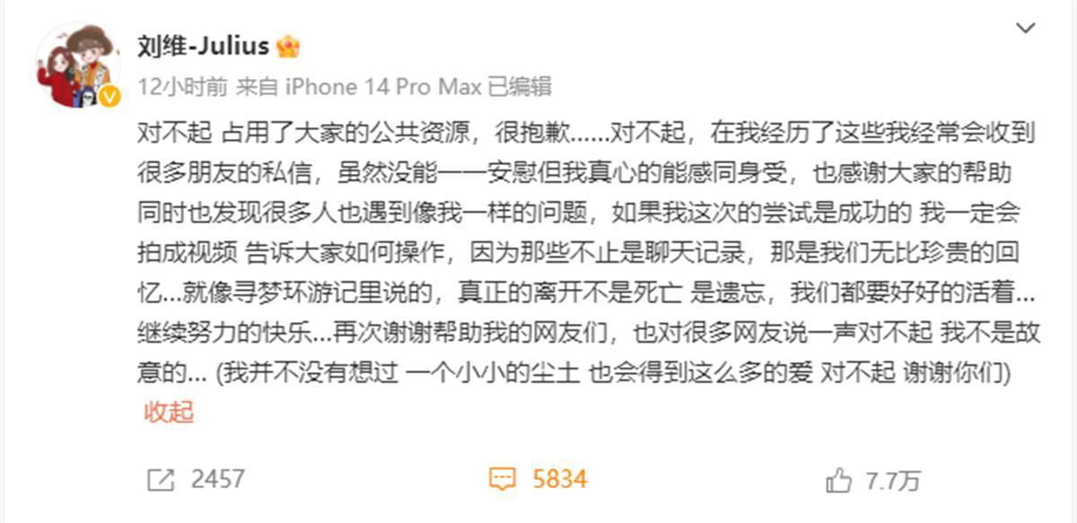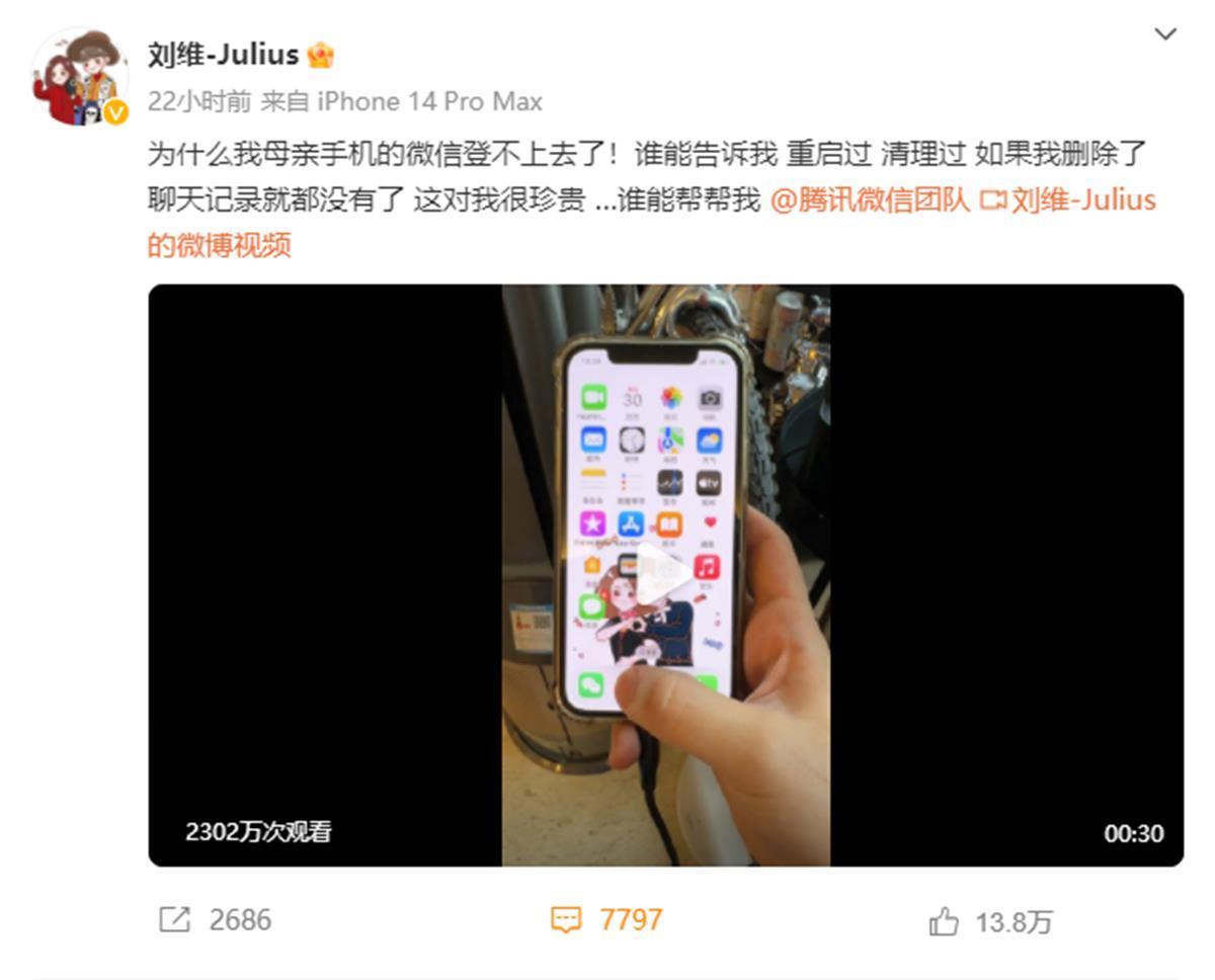7月30日,歌手、演员刘维在社交媒体发文向网友求助:“为什么我母亲手机的微信登不上去了!谁能告诉我,重启过、清理过、如果我删除了,聊天记录就都没有了,这对我很珍贵……谁能帮帮我。”