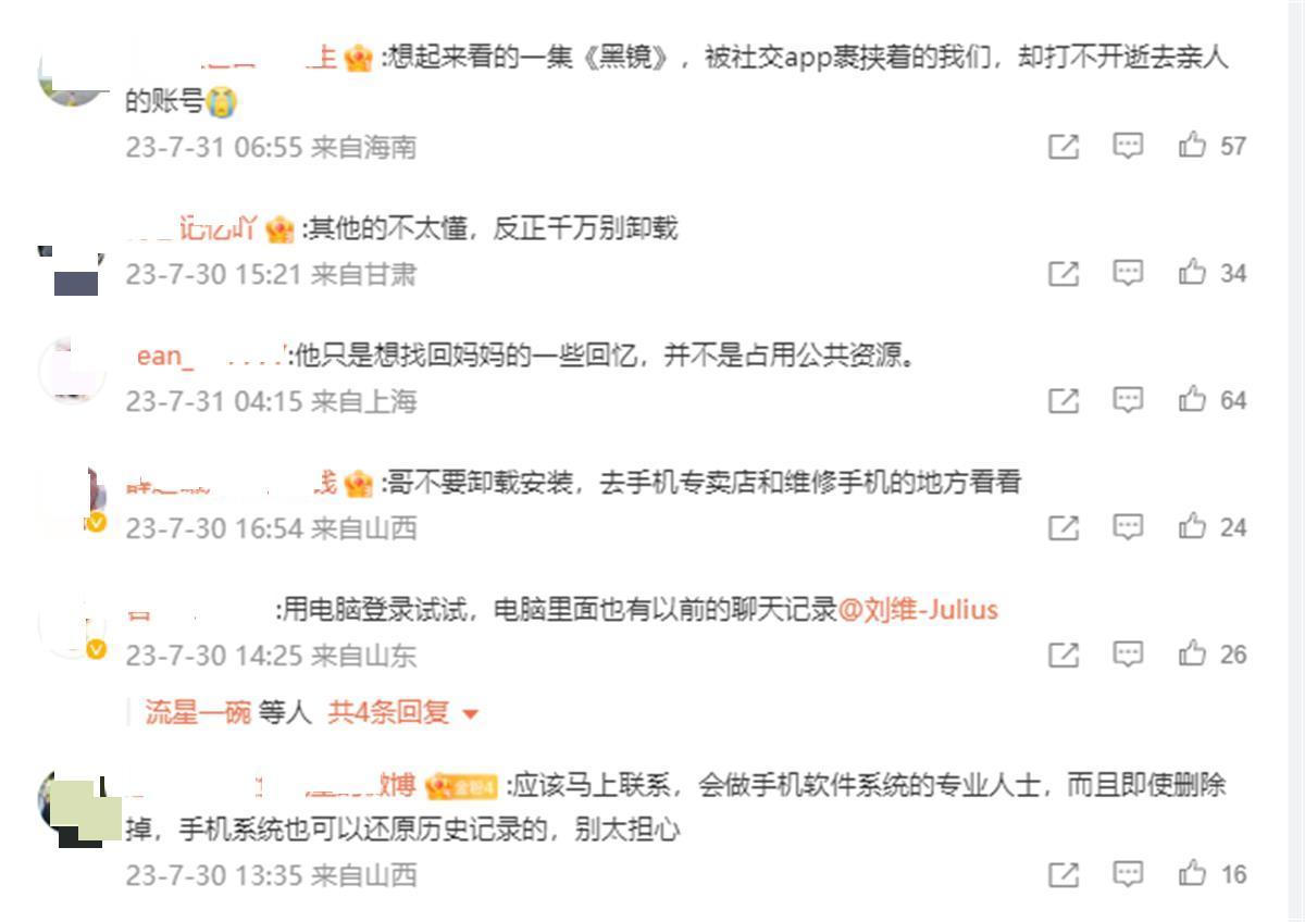 虽然手机微信出现故障,是刘维个人的私事,一般来说应该自行找手机售后和微信客服解决,但刘维的公开求助,却引发了很多网友的共情和理解。有很多网友都在评论区讲述自己亲人去世后,QQ号、微信号等个人通信账号被收回、停用,相关聊天记录丢失的经历,弥漫着失落和伤感的情绪。也有很多网友积极地给刘维支招,甚至发出很详细的教程,真心希望他不要留下遗憾。