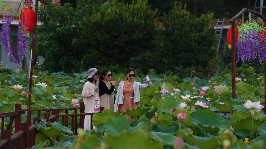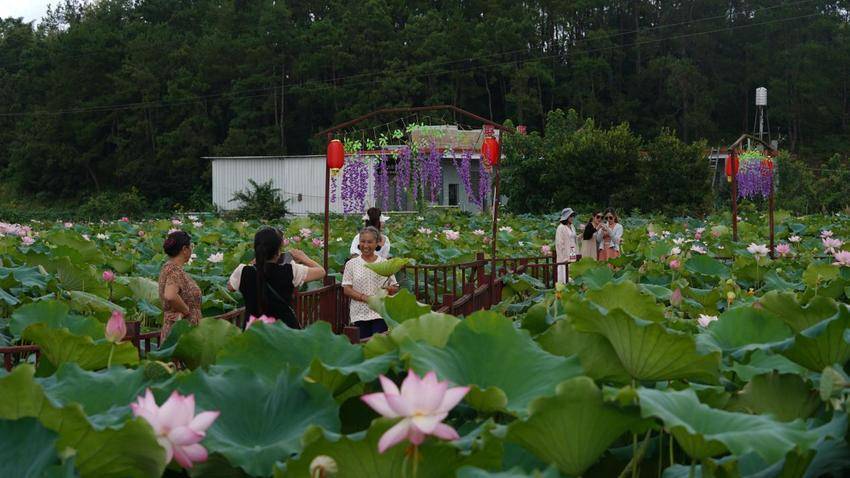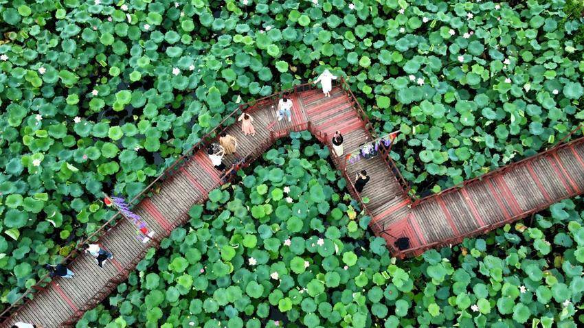 大量游客手持相机,穿梭在荷花池中,在满塘荷花前拍照打卡,体验夏日别样的乐趣。