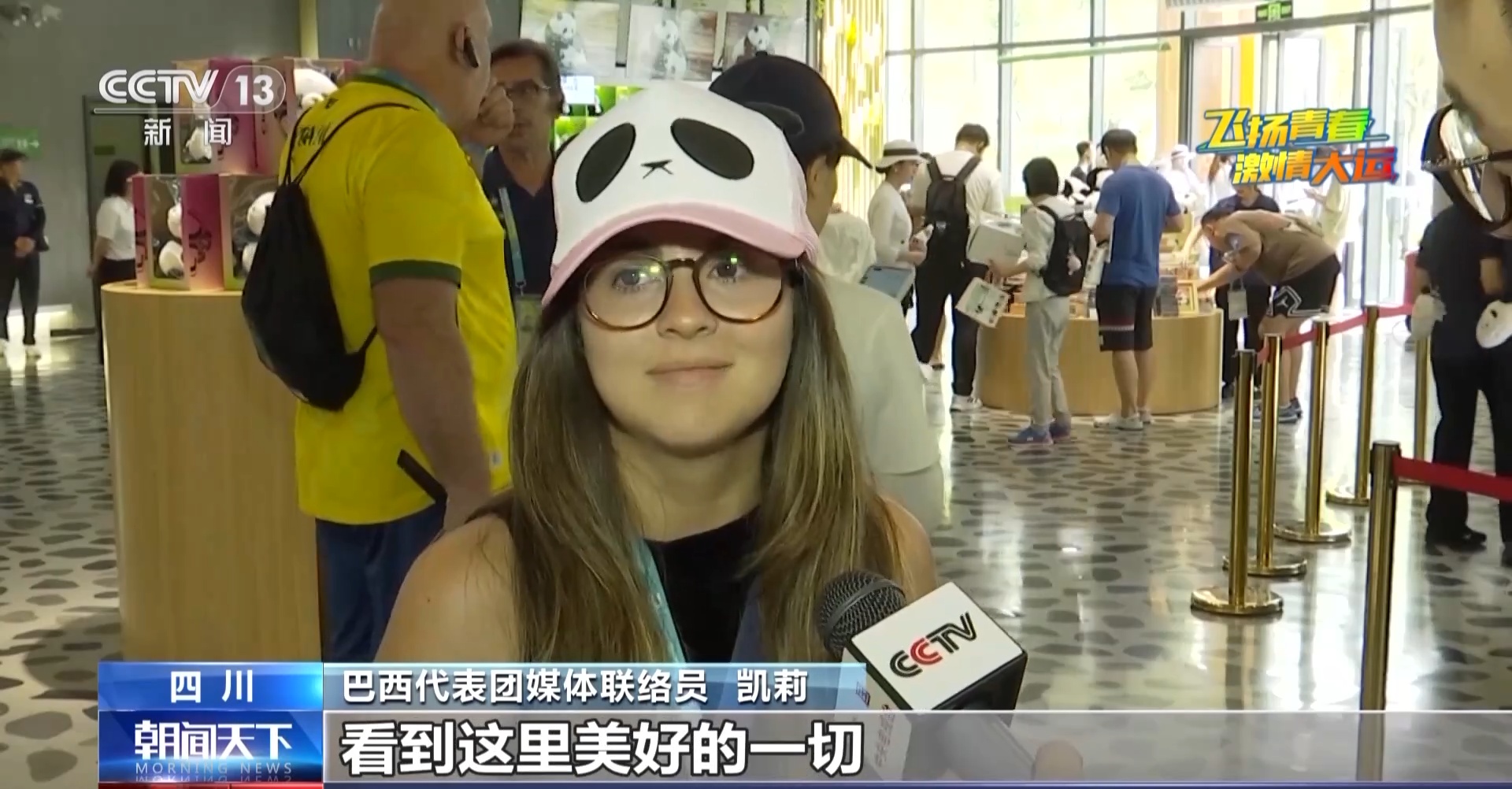 巴西代表团媒体联络员 凯莉:我非常开心能来到成都,看到这里美好的一切,很享受成都大运会带给我们的各种精彩体验。中国人非常善良,在成都这几天遇到的所有人都向我们传递着他们的热情友爱,我喜欢成都的一切。